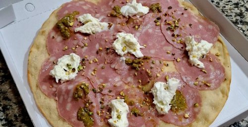 Mozzarella di bufala , Mortadella , Pesto di pistacchio , Granella di Pistacchio